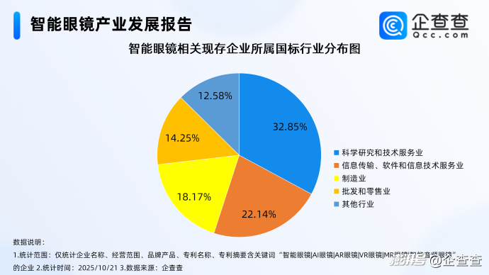 企查查數據顯示,從國標行業分布上看,國內智能眼鏡相關現存企業中,歸屬于科學研究和技術服務業的相關企業最多,占比達32.85%,其次為信息傳輸、軟件和信息技術服務業,制造業等,分別占比22.14%、18.17%。