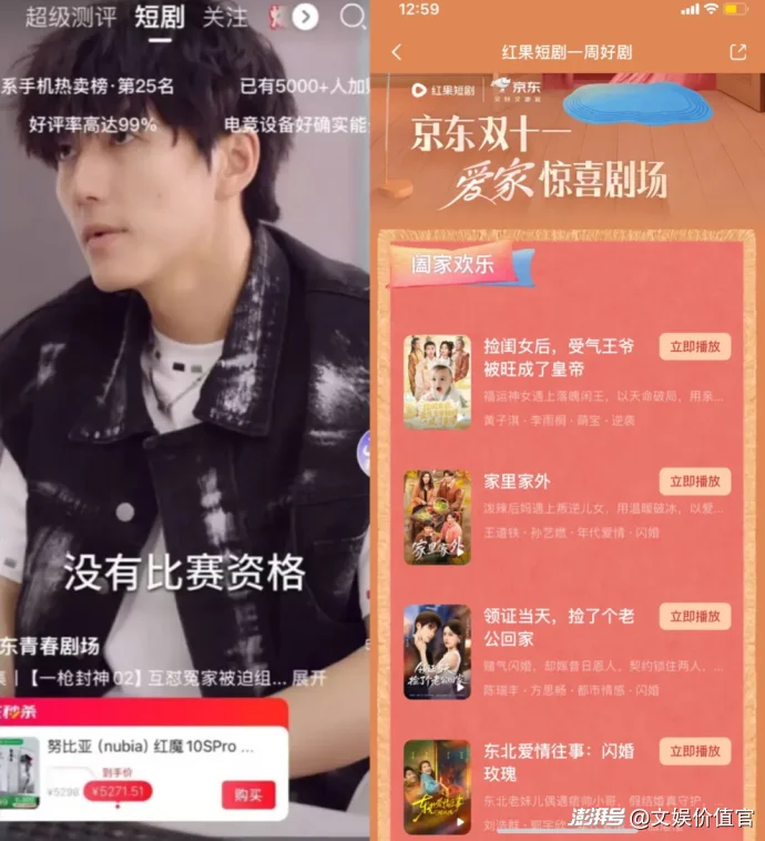 目前,京東APP內“短劇”頻道已經上線,其中大部分為免費短劇,文娛價值官觀察發現,在@京東青春劇場 的短劇掛著努比亞產品的購物鏈接,彰顯了京東對短劇業務的戰略級重視。