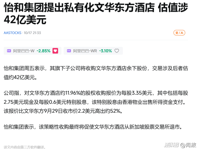 文華東方,就是那個(gè)住一晚能頂很多人一個(gè)月工資的奢牌酒店,被母公司怡和集團(tuán)用42億美元打包帶走,從新加坡股市私有化退市了。
