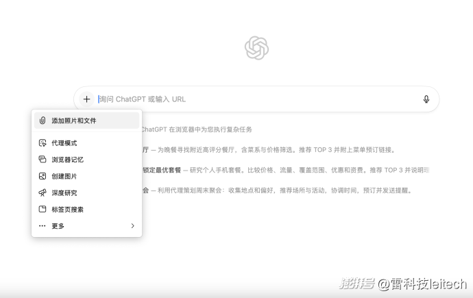 搜索框旁的「+」藏著ChatGPT- Altas的所有功能,深度研究、代理模式、畫布等,都在這里面。也可以添加文件和照片,和ChatGPT的app端保持一致。