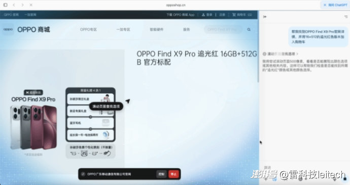 當我們在ChatGPT- Altas的搜索框里選擇「代理模式」后,主頁面會彈出「今天想做什么?」的提示詞。這時候我們就能描述自己需要完成的任務。比如,我想查看OPPO官網里最新發布的那款手機,代理接到任務后便開始分析需求,自動接管我們的鼠標,按照需求打開網頁,找到Find X9系列的詳情頁。