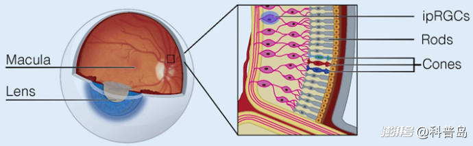 三種視網膜感光細胞位置略圖(圖片來源:維基百科)