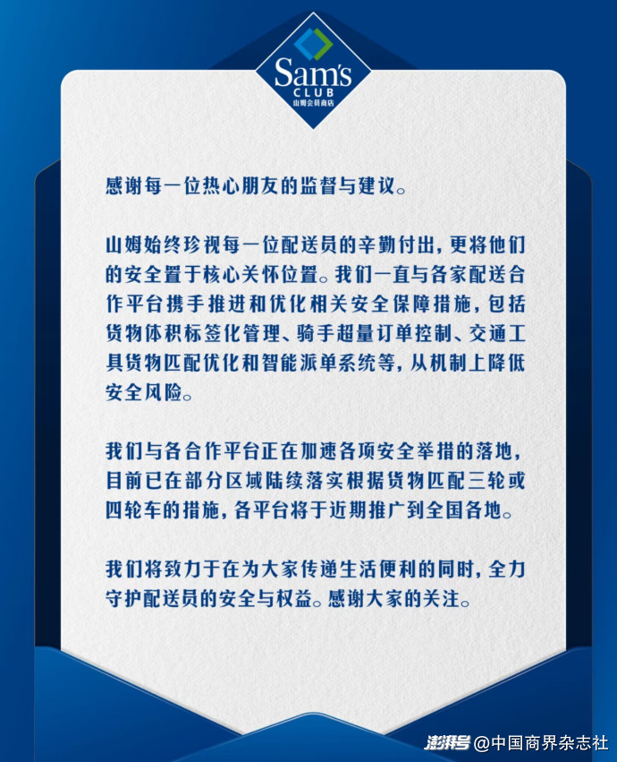 對于此次爭議,山姆會員商店發布公告稱,一直與各家配送平臺攜手推進和優化相關安全保障措施,包括貨物體積標簽化管理、騎手超量訂單控制、交通工具貨物匹配優化和智能派單系統等,從機制上降低安全風險。并與各合作平臺正在加速各項安全措施的落地,“目前已在部分區域陸續落實根據貨物匹配三輪或四輪車的措施,各平臺將于近期推廣到全國各地。”