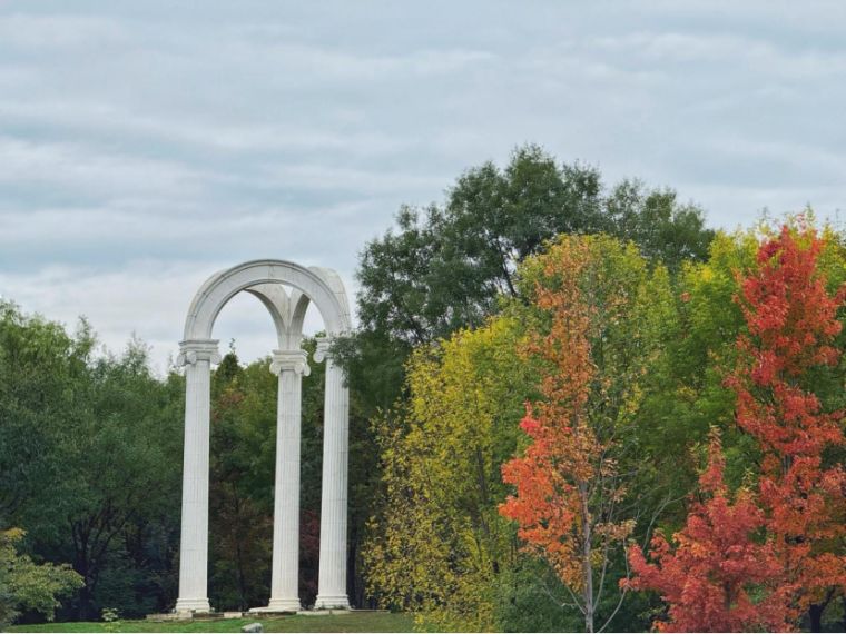 △亦莊之門在五彩斑斕的樹葉映襯下,更具肅穆之美了。孫佳蕊/攝