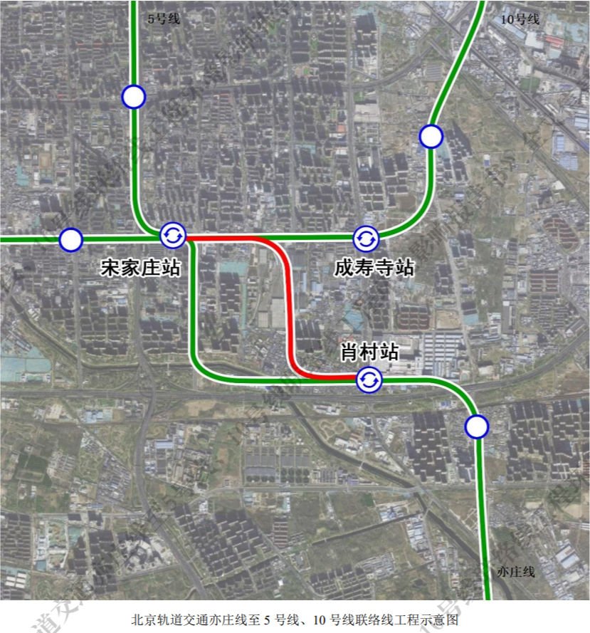 亦莊線至5號線、10號線聯絡線工程,南起朝陽區肖村站(不含),北至豐臺區宋家莊站(不含),線路全長約2.7公里,其中新建地下線路約2.2公里,利用既有線路0.5公里,均為地下線,無新建、改(擴)建場站。地下區間結構采用盾構法、明挖法和暗挖法施工,無爆破作業。