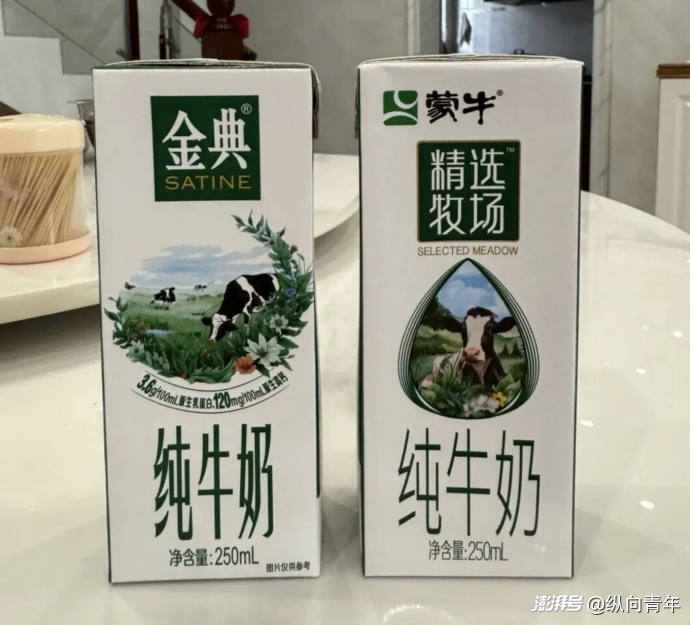 2023年,蒙牛推出的“精選牧場(chǎng)”純牛奶,外包裝的配色風(fēng)格、元素位置等,幾乎都與“金典”一模一樣,只是在一些細(xì)節(jié)上略有不同。