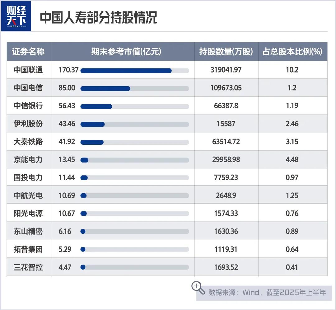 從高到低看,中國聯通、中國電信、中信銀行、伊利股份、大秦鐵路位列中國人壽持倉市值TOP5,中國人壽對幾家公司的持有參考市值在40億到170億元之間。