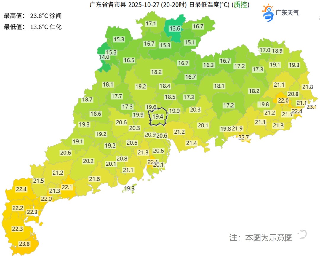 27-28日,南部沿海市縣多云間陰天,局部有零星小雨,其余市縣多云間晴天。最低氣溫:粵北市縣16~18℃,南部沿海市縣21~23℃,其余市縣18~20℃。