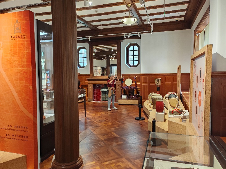 結束了“音樂城堡”的參觀后,我們一路向西,來到了相隔不遠的美育樓。這棟始建于1936年的建筑是一棟典雅別致的紅磚坡屋頂英式假三層花園住宅,豐富的屋頂形式、外露的木框框架、別致的老虎窗造型,具有英國都鐸風格特色,網格型的吊頂與紋理清晰的金柱相互映襯,仿佛承載著歷史的厚重,最初是德國商人的住宅,后來長期作為猶太人俱樂部,1958年劃歸上海音樂學院,成為校舍的一部分。作為“優秀歷史建筑”的美育樓,如今已經成為校園對外開放的“東方樂器博物館”。