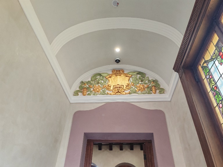 室內的裝潢細節十分精致考究,每一個廳室、每一個過道、每一部樓梯都有著造型各異的裝飾和恰到好處的點綴,栩栩如生的浮雕、精雕細琢的木飾、逼真如畫的墻紙、古樸典雅的壁爐,令人賞心悅目。我們特別注意到:在一些浮雕、木飾上有不少“酒神”的圖案,尤其是北邊塔樓上的那三尊“酒神”雕塑,更令人遐想無限,當年的主人也許是喝酒高手;也許是品酒大師;也許是名酒收藏家,酒文化在這里占有了重要的一席之地,是一座文化價值很高的優秀歷史建筑。2022年起,“音樂城堡”經過兩年間的修繕,“修舊如舊”、保留原貌、煥新融合,與美麗、摩登、富有情調和海派“腔調”的滬上最繁華商業街之一的淮海路“融為一體”,使這棟“洋房”煥發新生、重放光彩。成為了一個文化底蘊深厚、海派氣息濃郁、時尚新潮休閑的新景觀。