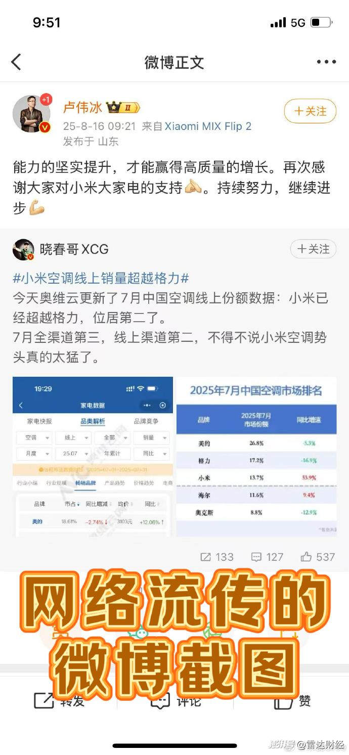 8月16日,盧偉冰在微博轉發了一位博主微博,顯示小米7月線上銷量超越格力,位居行業第二。