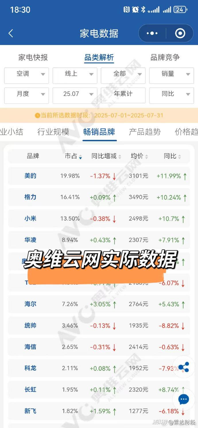 朱磊曬出的截圖顯示,7月格力空調線上市占率為16.41%,小米為13.50%,小米并未反超。