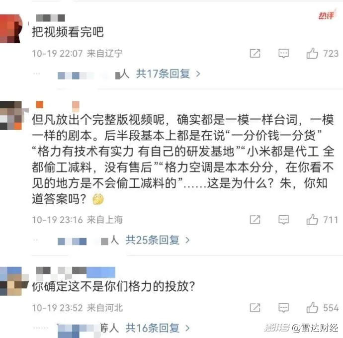 然而,有網友看完相關視頻后卻指出,視頻后半段也存在著“格力有技術、有實力”“小米都是代工”等對格力的夸贊,并在評論區留言,調侃格力“自己網暴自己”。