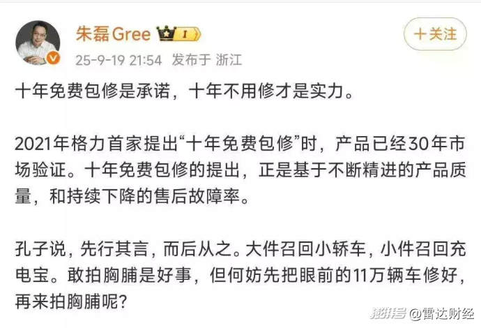 2025年9月19日,小米集團總裁盧偉冰在直播中宣布米家空調全系開啟“10 年免費包修”,此舉直指格力2021年構筑品牌護城河—— “十年免費包修”政策。此外,小米還更進一步,將中央空調也納入保修范圍。