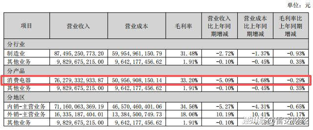分產品來看,占營收比例最大、覆蓋家用空調銷售的消費電器業務增長乏力,該板塊上半年營收762.8億元,同比下滑5.09%,毛利率下降0.29%至33.20%。