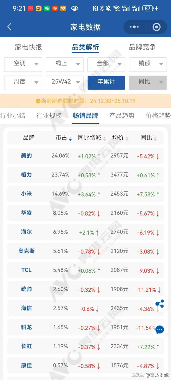10月25日,雷達財經查詢奧維云網發現,2024年12月30日至今年10月19日期間,美的以24.06%的市占率位列第一,格力以23.74%的市占率緊隨其后,小米以14.69%的市占率位列第三,與格力存在較大差距。