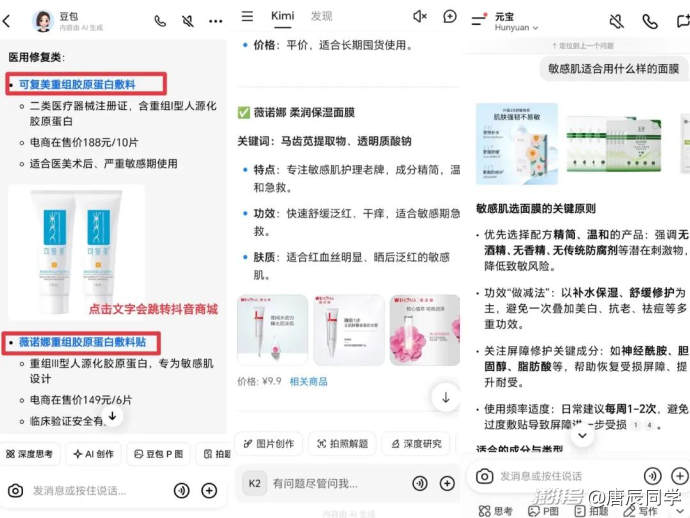 圖源:豆包(左)、Kimi(中)、元寶(右)的回復(fù)中都出現(xiàn)商品了鏈接 定焦One