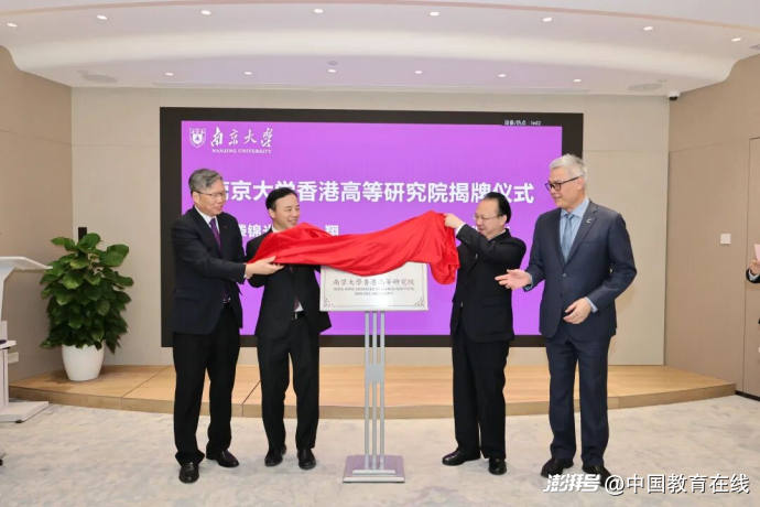 譚鐵牛、香港數(shù)碼港管理有限公司行政總裁鄭松巖、香港大學(xué)校長張翔、香港理工大學(xué)校長滕錦光共同為“南京大學(xué)香港高等研究院”揭牌。
