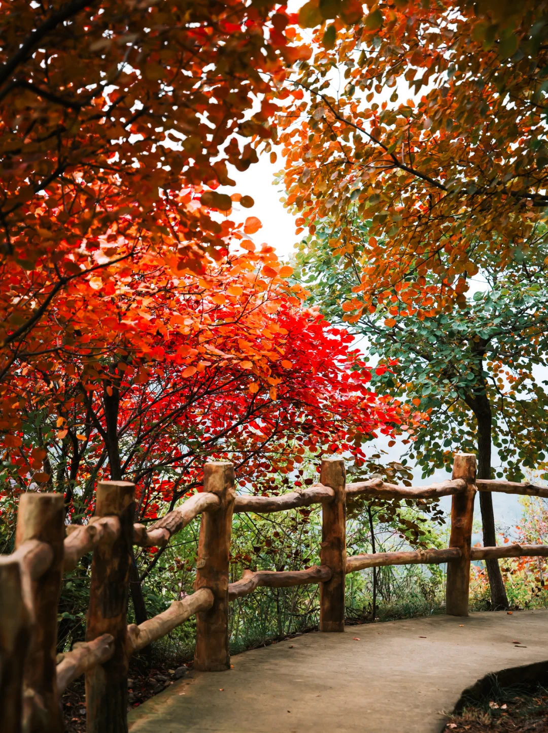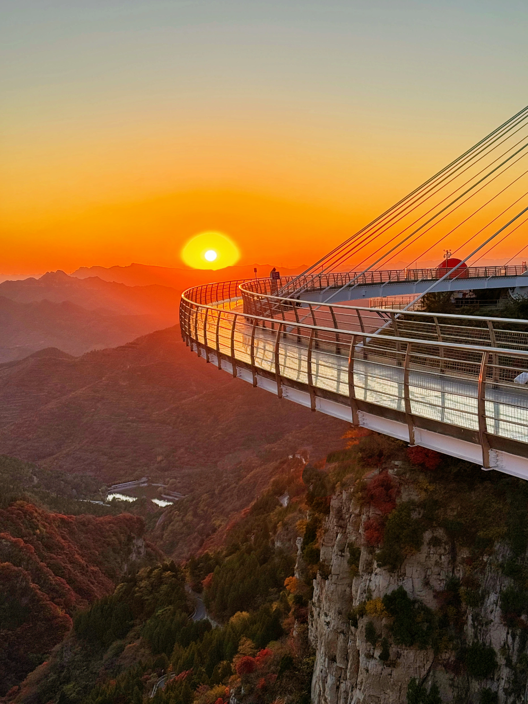 行至玻璃橋,腳下是萬丈深谷,眼前是層林盡染,這座獲過兩項國際大獎的“天空之橋”,成了賞紅的絕佳觀景臺。
