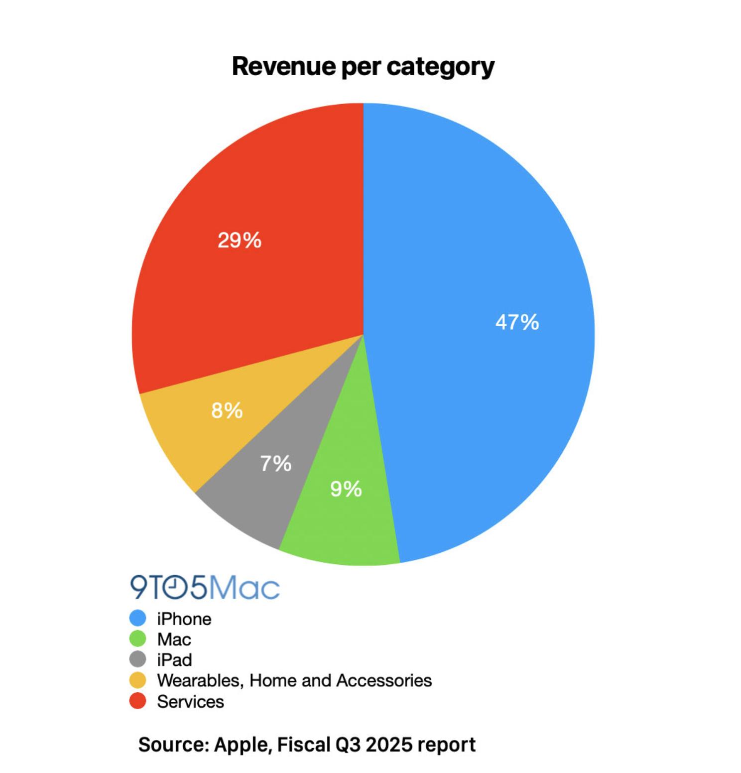 蘋果今年第三財季總收入 940 億美元,服務收入 274 億美元,實現兩位數增長的同時,占比更是達到 29%,「遙遙領先」iPhone 之外的其它所有類別收入來源。