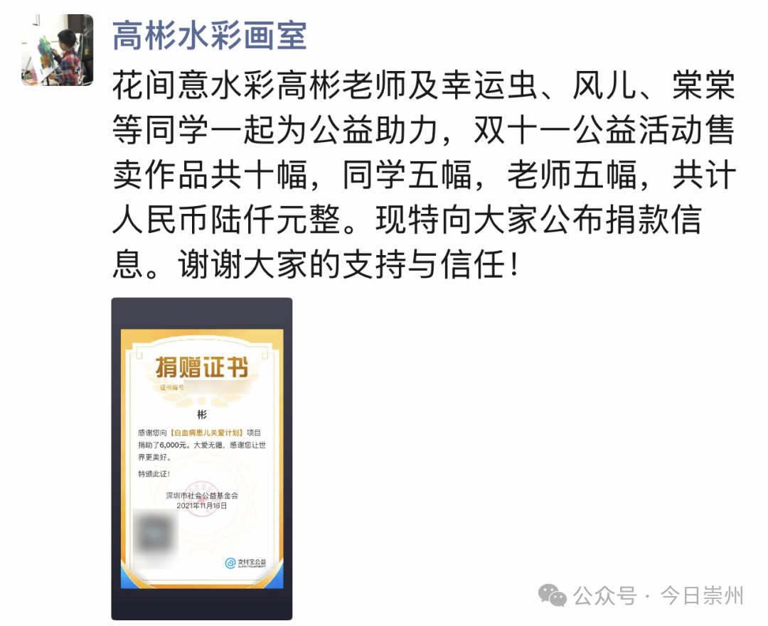記者在與高彬夫婦聊天中得知,夫婦倆一直熱衷公益事業。2008年汶川地震期間,高彬夫婦和朋友通過義賣畫作自籌數萬元善款捐助災區人民。