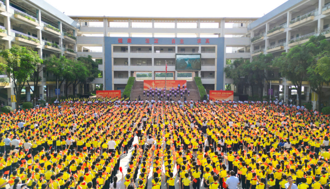 逢國慶前夕,佛山定期組織全市中小學、幼兒園開展“向國旗敬禮”活動。今年9月30日,佛山全市133萬名中小學師生同升國旗、同唱國歌;中國好人、全國文明家庭代表與師生一同朗誦紅色經(jīng)典;三位年逾九旬的佛山抗戰(zhàn)老兵還以視頻形式,在國旗下與同學們回憶烽火歲月,厚植愛國情懷。