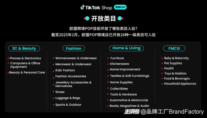 在歐盟跨境POP模式下,26種一級類目已全面開放招商,涵蓋服飾鞋包、3C數碼、家居生活、美妝個護等主流消費領域。