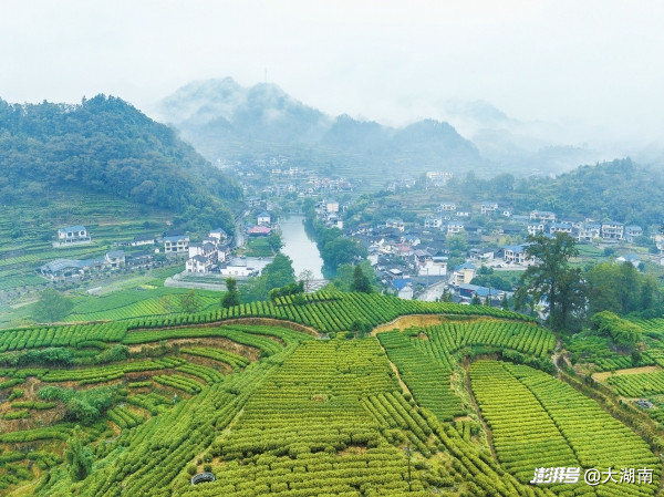 10月30日,湖南湘西吉首市馬頸坳鎮(zhèn)隘口村秋雨蒙蒙,茶園、村莊、河流與青山在雨霧中交織出一幅詩意盎然的生態(tài)畫卷。彭璟 攝