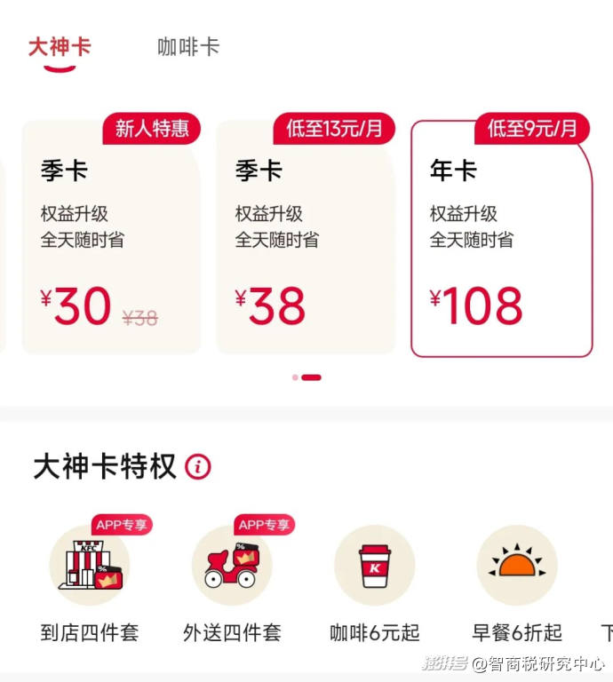 比如,購買肯德基大神卡的消費者,可以享受6元咖啡、6折早餐、滿額免配送費等優惠;在肯德基小程序上,普通消費者也有機會獲得,29.9元六個蛋撻、指定飲品買一送一等福利。