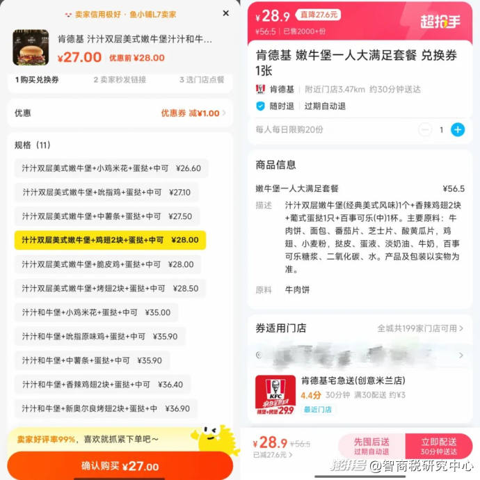 另一邊,在淘寶超搶手頁面,肯德基嫩牛堡大滿足套餐,售價28.9元;同款代下單優惠價27元,比淘寶便宜了1.9元。