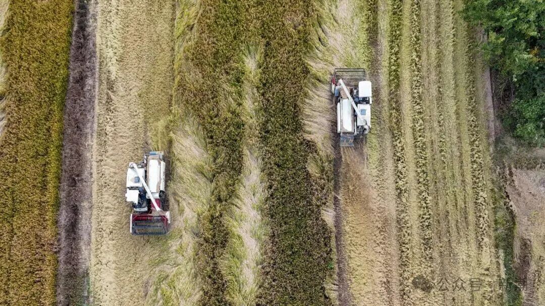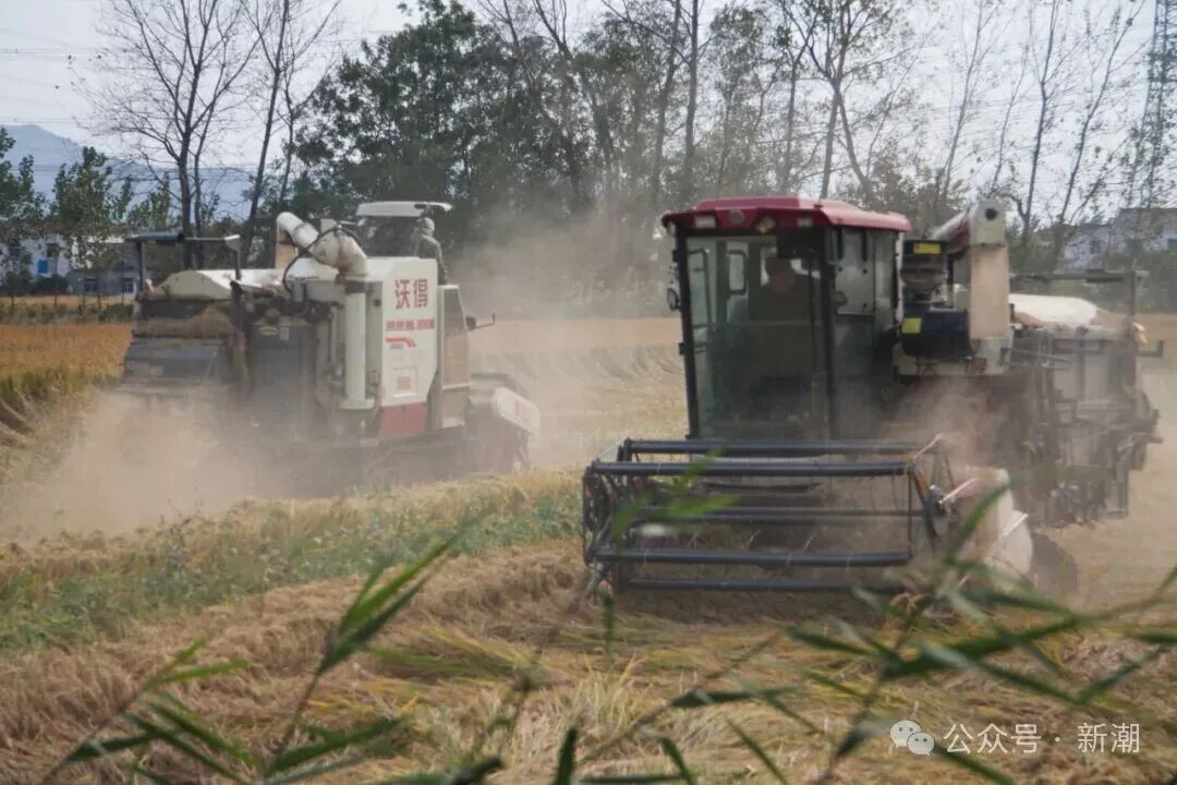 收割機在田間工作,揚起翻飛的塵霧和稻芒。