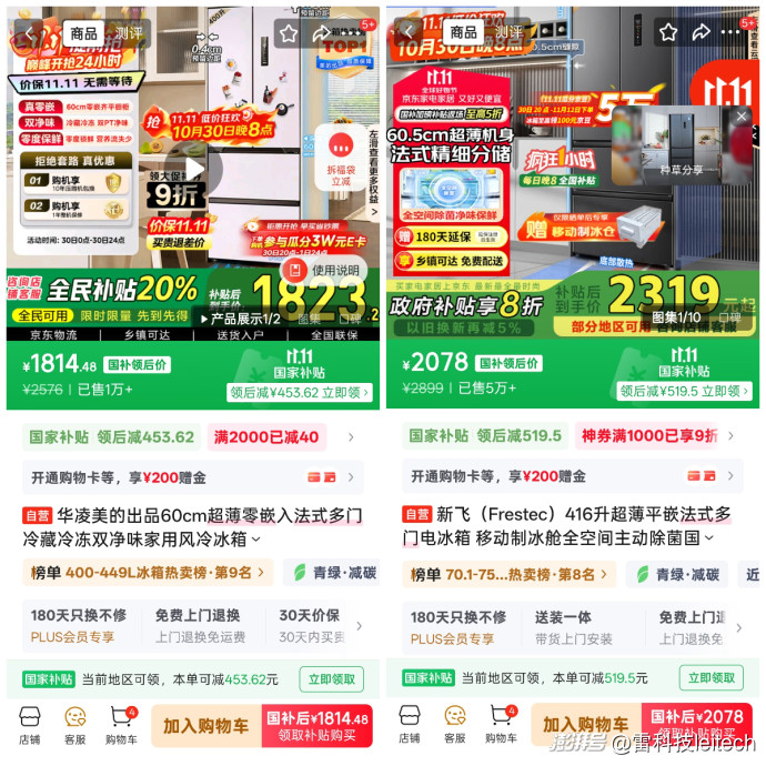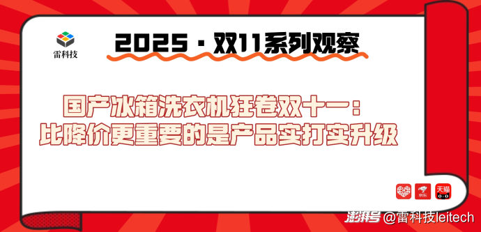 在這場(chǎng)持續(xù)一個(gè)多月的「史上最長(zhǎng)雙十一」中,冰箱、洗衣機(jī)也成了最大贏家之一。國(guó)家以舊換新補(bǔ)貼、平臺(tái)「官方立減」「10 倍賠價(jià)保」等疊加上陣,讓消費(fèi)者眼前的優(yōu)惠標(biāo)簽層出不窮。品牌方面,海爾打出「全品體驗(yàn)盛典」,主推零嵌冰箱和平嵌設(shè)計(jì);美的推出 AI 三筒洗衣機(jī),線下國(guó)補(bǔ)聯(lián)動(dòng);海信和容聲強(qiáng)調(diào)「方糖平嵌」與健康保鮮;TCL 則主推 AI 平嵌冰箱和熱泵洗烘。