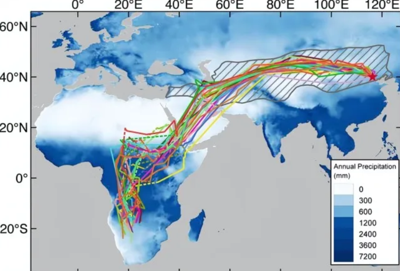 然后,從蒙古國進入我國的新疆北部,之后跨越準噶爾盆地進入中東,這段旅程合計長達幾千公里,但它們只用了半個月左右就完成了。
