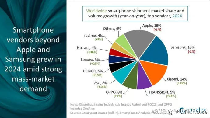 ▲2024年全球智能手機(jī)市場(chǎng)份額變化情況 圖源:canalys