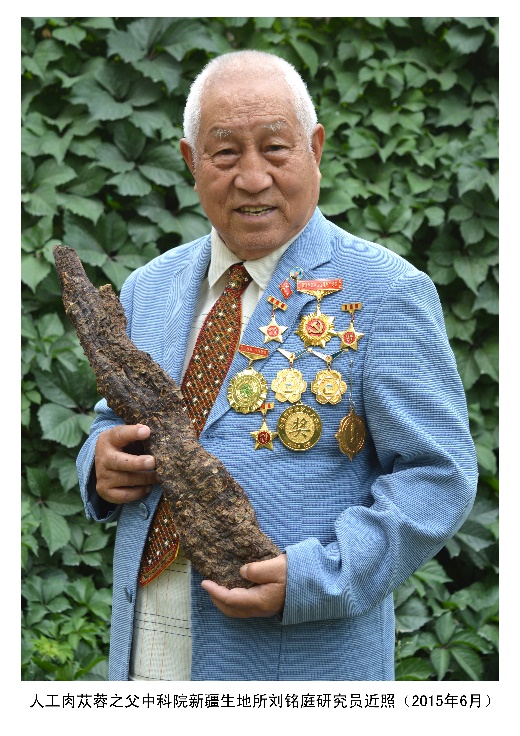 1993年4月,劉銘庭辦理了退休手續(xù)。但他退而不休,把全部身心投入到幫助邊疆地區(qū)農(nóng)民的脫貧致富上。1997年, 65歲的劉銘庭說(shuō)服老伴、兒子與他一起來(lái)到和田地區(qū)于田縣奧依托格拉克村一個(gè)沙窩子里,說(shuō)服兒女舉家籌款,并在當(dāng)?shù)卣闹С窒?,辦起了占地500畝的于田縣大蕓種植場(chǎng)。2003年,種植在紅柳根部的肉蓯蓉開(kāi)始收獲,畝產(chǎn)達(dá)100公斤以上,最好的畝產(chǎn)在200公斤,一畝沙地產(chǎn)出的肉蓯蓉相當(dāng)于天然林產(chǎn)出的數(shù)百倍。
