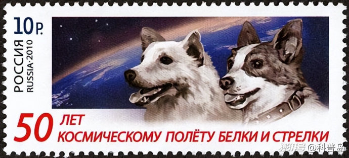 2010年俄羅斯發(fā)行的一枚郵票上印有貝爾卡和斯特列爾卡,以慶祝它們太空飛行50周年(圖源:Russian Post)