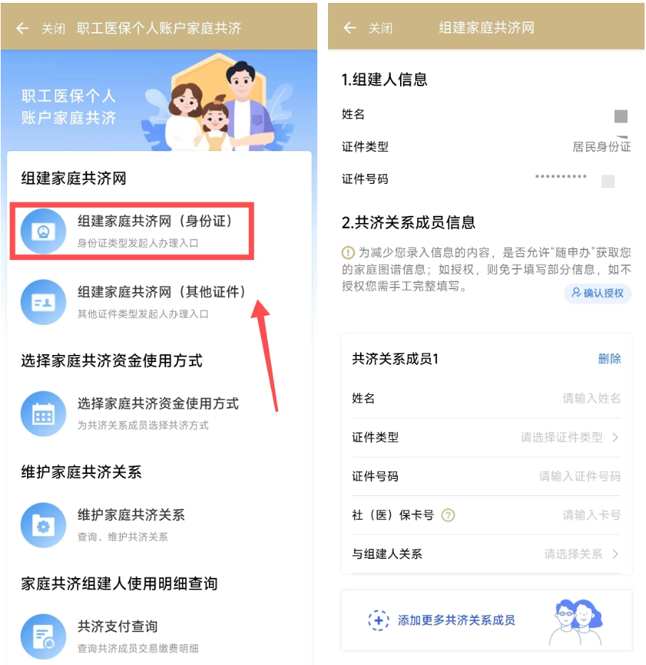 第二步:輸入組建人信息、共濟關系成員后發起組建,組建成功后選擇共濟方式即可。