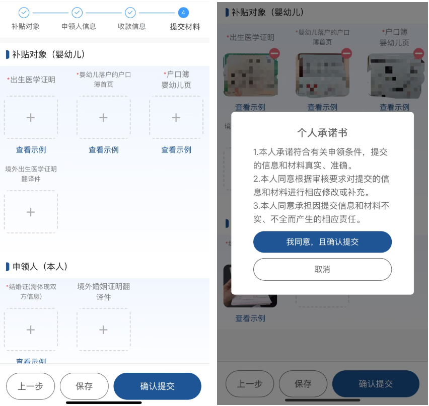 第五步:按照提示提交出生醫(yī)學(xué)證明、嬰幼兒落戶戶口薄首頁、戶口薄嬰幼兒頁、結(jié)婚證等判定撫養(yǎng)關(guān)系的相關(guān)材料,點(diǎn)擊“確認(rèn)提交”按鈕。