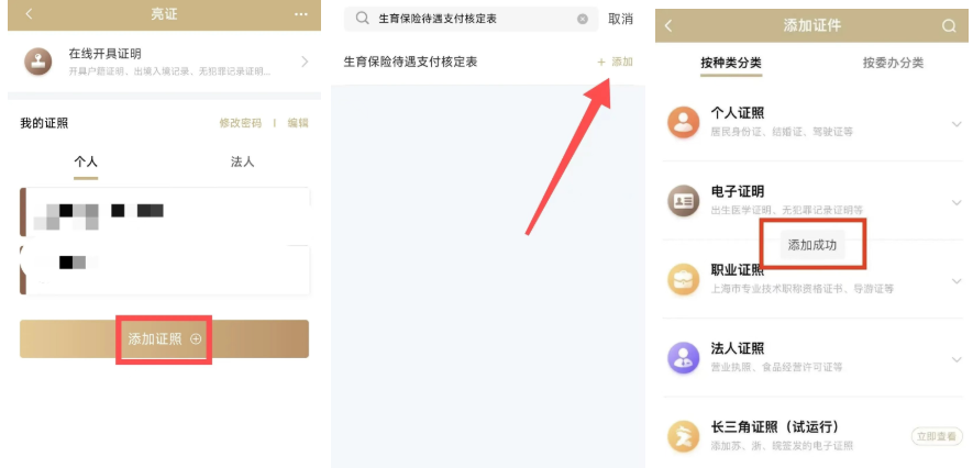 第二步:點(diǎn)擊添加證照,搜索“生育保險待遇支付核定表”并點(diǎn)擊添加按鈕。