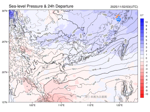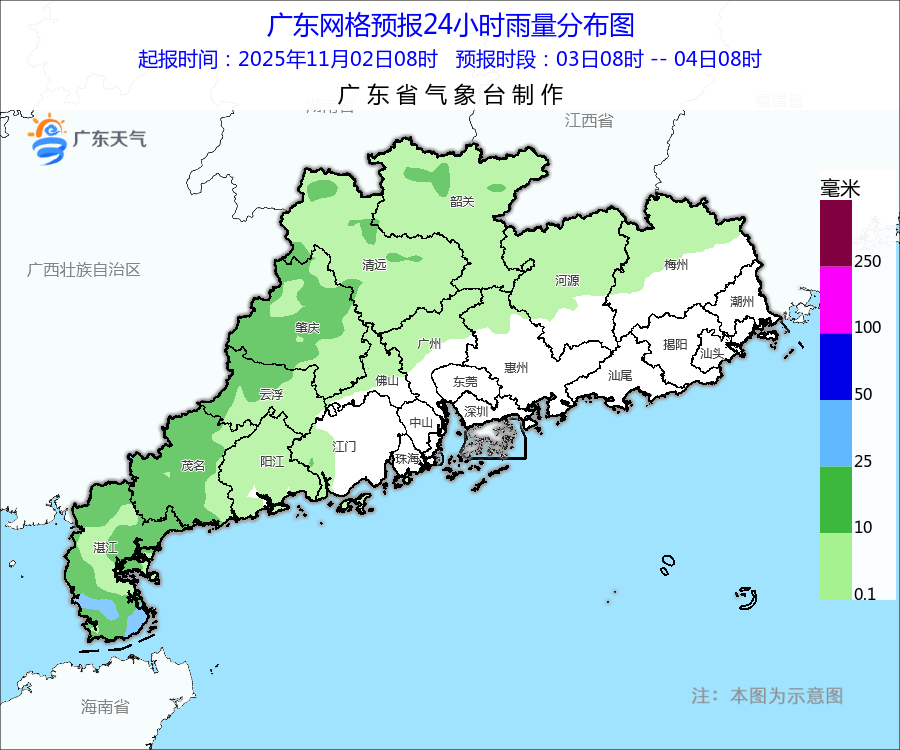 11月3日,粵北、珠三角西部和粵西市縣多云間陰天,有分散小雨,其余大部市縣多云到陰天。最低氣溫:南部沿海市縣20~22℃,粵北偏北市縣14~17℃,其余市縣18~21℃。