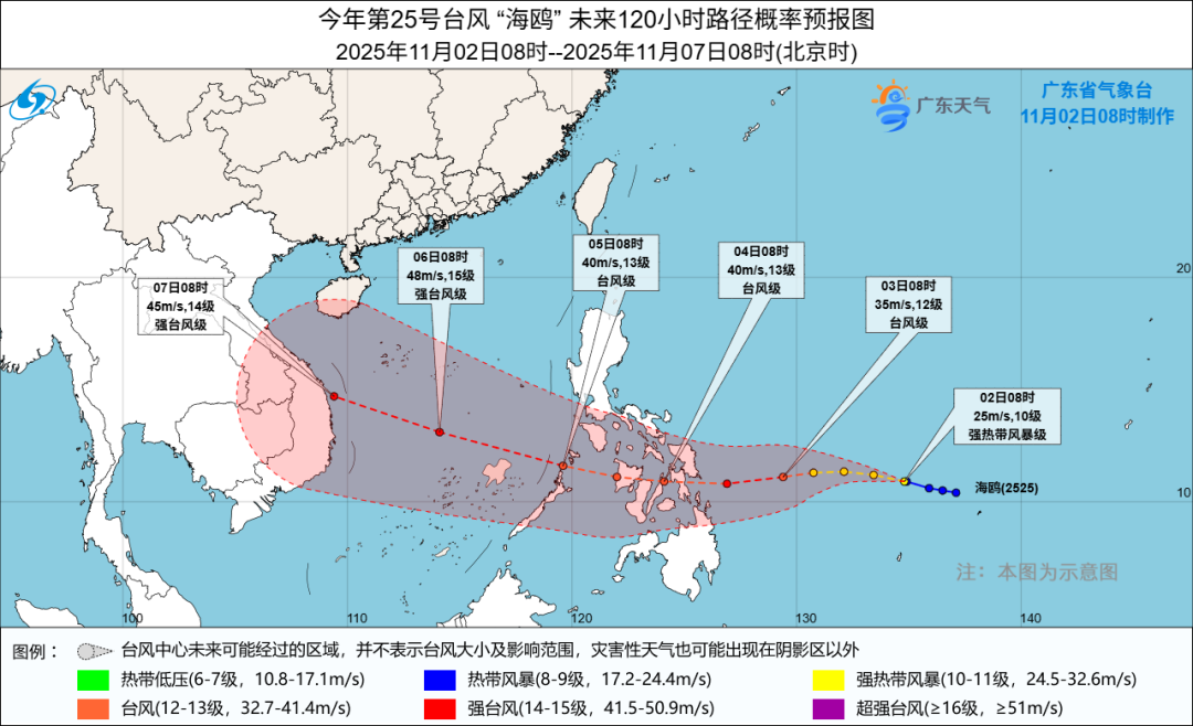 預計,“海鷗”將以20公里左右的時速向偏西方向移動,4日穿過菲律賓中部,5日移入南海海面,5-7日橫穿南海南部海面趨向越南中南部沿海,強度逐漸加強,最強可達臺風級或強臺風級(13~15級),過程期間其中心距離我省最近約700公里(距離廣州約1000公里),對我省陸地和近海無直接影響。
