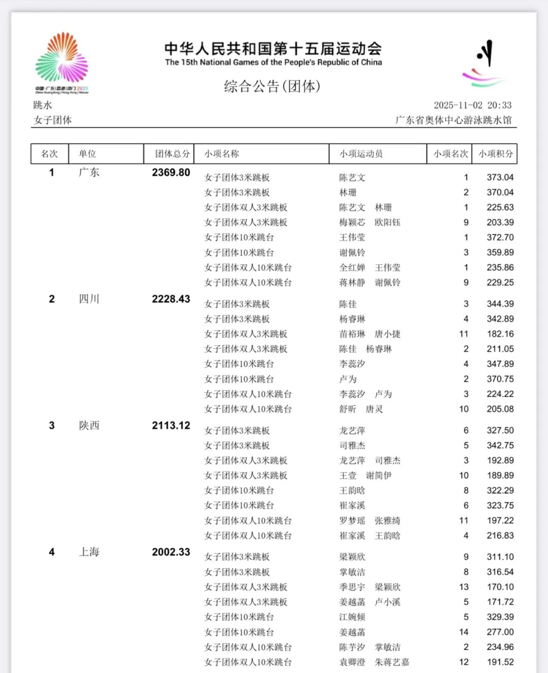 最終廣東隊總分排名第一,奪得跳水女子團體項目冠軍。