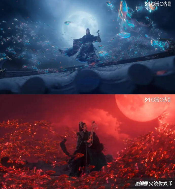 而在讓觀眾切身感受到玄俠定位下,武學(xué)世界的極致浪漫與極致想象力這件事上,《水龍吟》可謂下了苦工。比如唐儷辭和柳眼擅長(zhǎng)的都是周睇樓的音殺功,即靠樂(lè)器擊打出的音樂(lè)造成物理傷害,為了呈現(xiàn)音殺功的視覺張力,《水龍吟》不僅讓琴弦化為了有形的“劍刃”,更是為“音波攻擊”賦予了意識(shí)流美感,琴聲既可化魚,亦能煉龍,唐儷辭與柳眼的花海對(duì)決中,漫天飛舞的花瓣更是為音殺功平添了一層古典意蘊(yùn)。