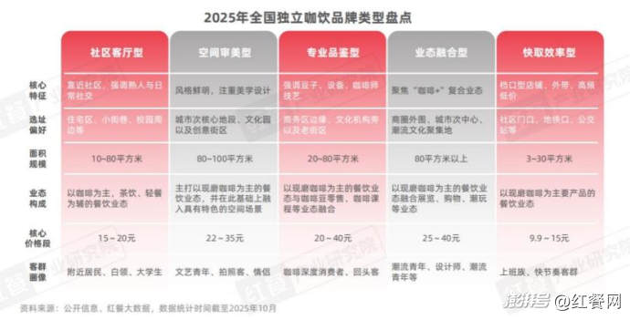 而獨立咖飲品牌則通過靈活選址與多元業態滲透消費者日常生活,并逐步形成五大運營形態。據紅餐產業研究院梳理,當前獨立咖飲品牌主要可以分為社區客廳型、空間審美型、專業品鑒型、業態融合型以及快取效率型這五大類型,它們在選址、面積、業態構成、價格帶以及客群等維度均呈現出各自獨有的特征。