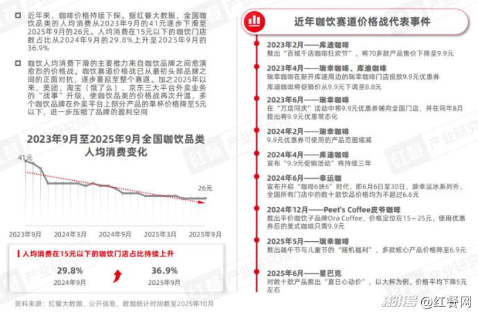 近年來,咖啡價格持續下探。據紅餐大數據,全國咖飲品類的人均消費從2023年9月的41元逐步下滑至2025年9月的26元。人均消費在15元以下的咖飲門店數占比從2024年9月的29.8%上升至2025年9月的36.9%。