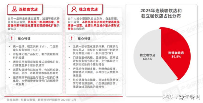 從市場參與者來看,咖飲品類的參與者按照經營模式可以分為連鎖品牌和獨立品牌兩類。據紅餐大數據,2025年由獨立品牌開出的獨立咖飲店占比達到60.5%,而連鎖品牌開出的連鎖咖飲店占比也接近四成。
