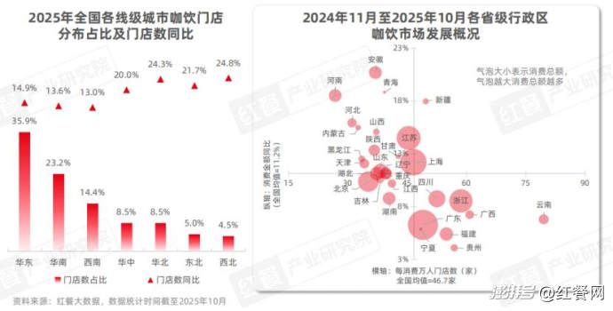 區域分布方面,據紅餐大數據,華東、華南、西南是咖飲門店數排名前三的區域,占比分別達到35.9%、23.2%以及14.4%。值得注意的是,盡管華中、華北、東北、西北區域的咖飲門店數占比均不足10%,但這些區域的咖飲門店數量增長較快,門店數同比均超過20%。