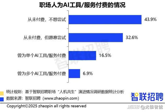 據智聯招聘2025年調研顯示,56.1%的職場人愿意為AI服務付費,其中23.4%的職場人已完成AI工具付費行為,16.5%曾為單個AI工具/服務付費,如購買單月會員,6.9%職場人曾為多個AI工具/服務付費,而24.1%高管愿意為單個AI工具支付200元以上的單月費用。
