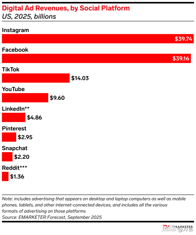 Reddit是今年最讓人意外的。單看收入,它不算大——13.6億美元。但增速非常猛,eMarketer的數據是55.6%,甚至超過了Twitter(X)。這說明它在廣告主側的吸引力正在快速上升,可能跟它社區里的“真實討論感”和信任氛圍有關。
