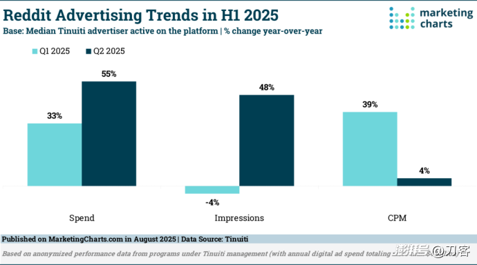 獨立營銷公司Tinuiti的報告顯示,2025年第二季度,在Reddit上活躍的廣告主,投放額同比增長了55%。這說明大家確實在把預算投向那些“更可信”的地方。